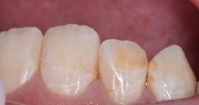 3つ目よりも4つ目の方が歯が白いのがわかるでしょうか?実際には4つ目の方が削っているので、深いわけです。深い、ということは写真を撮る時に暗くなりやすいはずです。それにも関わらず、4枚目の方が明るい=3枚目の汚染されている範囲が広い、ということです。