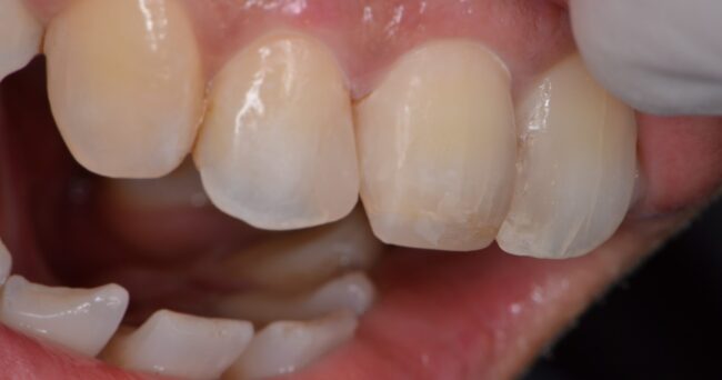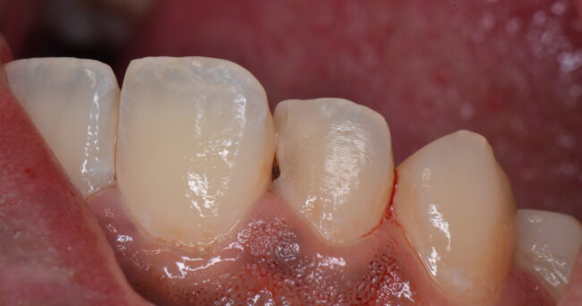 この方の場合は根本が過去にすすんだ虫歯、上の方に現在進行中の虫歯がありました。↑写真の歯と歯の間に、変に白い部分が歯の中の方に入っているのが見えると思います。これが現在進行中の虫歯です。