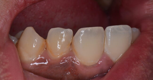 処置前です。間が茶色いだけに見えると思います。写真だとやはりわからないですね。現実は奥が透けて見えるのですが・・・