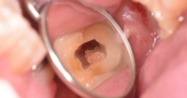 歯の根元に黒いものが透けているのが、なんとなく見えると思います。