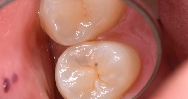 外からだとよくわかりません。削っていくと、まるでそこだけマーキングしたように虫歯が現れてきます。