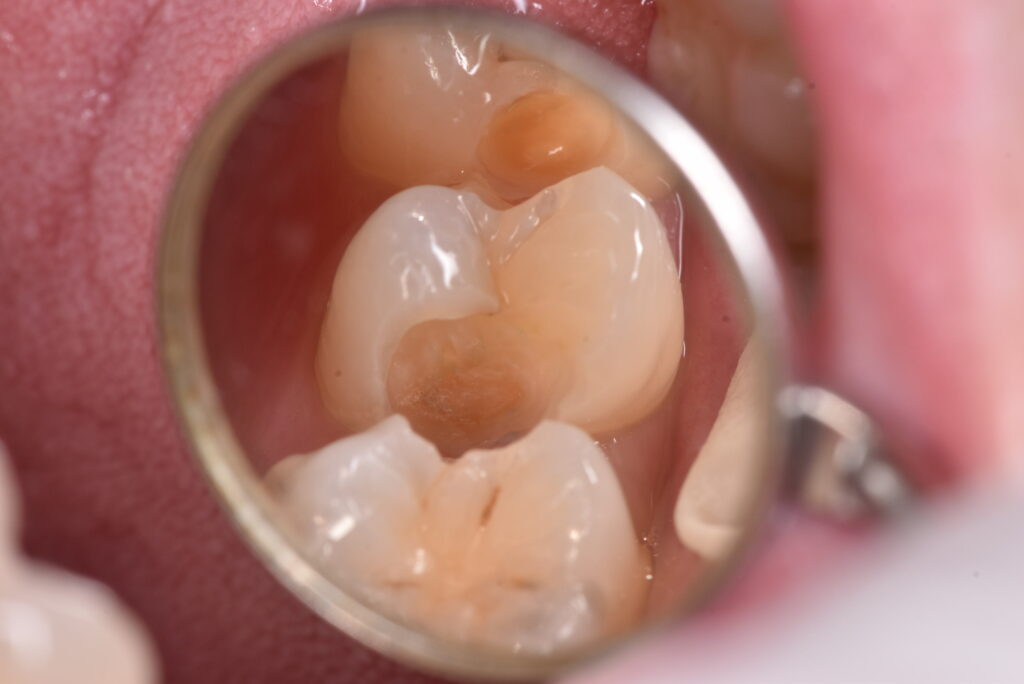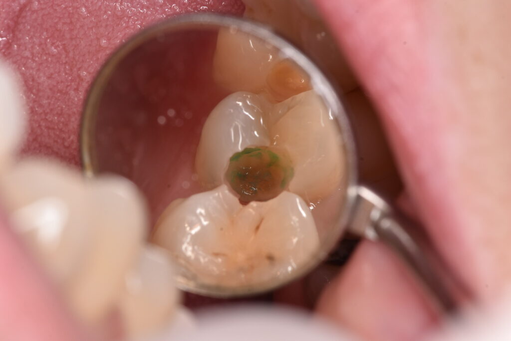 神経に到達する寸前くらいの、深いむし歯が広がっていました。これまでのブログでも書いた通り、今回も症状はありません。では、問題なかったのか?でいうと、答えは上の写真に示した通りです。