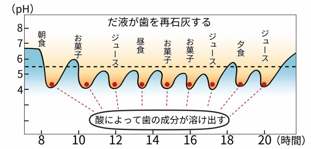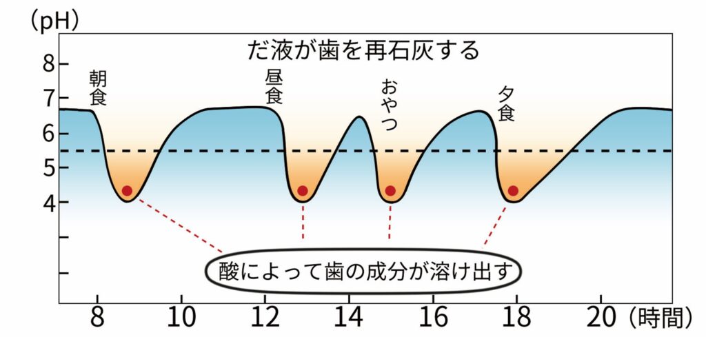 これにより、歯が溶けても、その分修復する作用が働き、むし歯にならずに済んでいるのです。しかし・・・食べる頻度が高かったり、長時間食事をしたりしていると、口の中が再石灰化に向かわなくなります。結果として、むし歯が再発してくるのです。